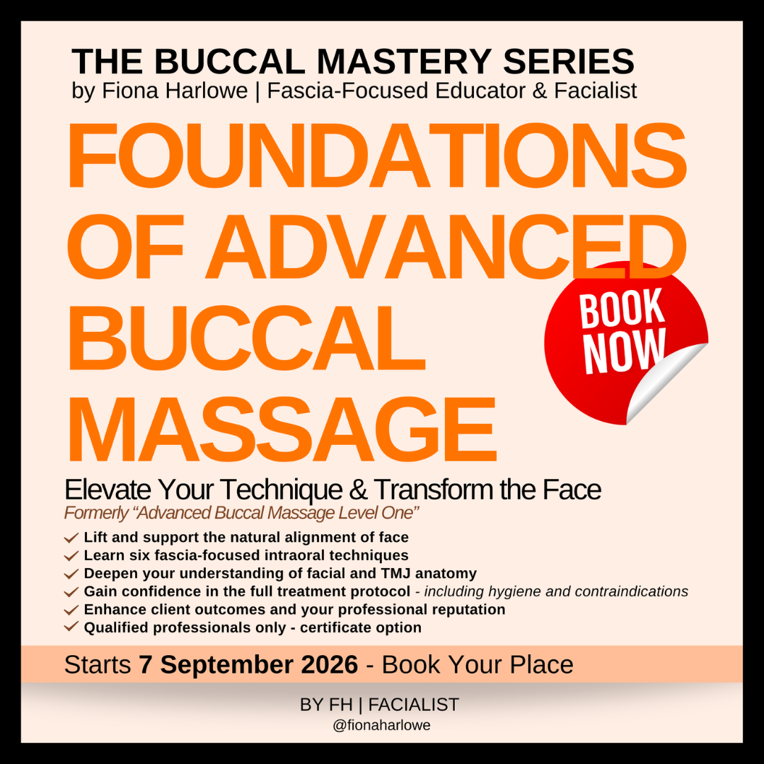 Fiona Harlowe is a facialist and advanced clinical massage bodyworker specialising in fascia-focused face, buccal and TMJ massage. Driven by a passion for anatomy, Fiona is dedicated to elevating understanding of facial structure and ageing within the facialist and skincare industries.