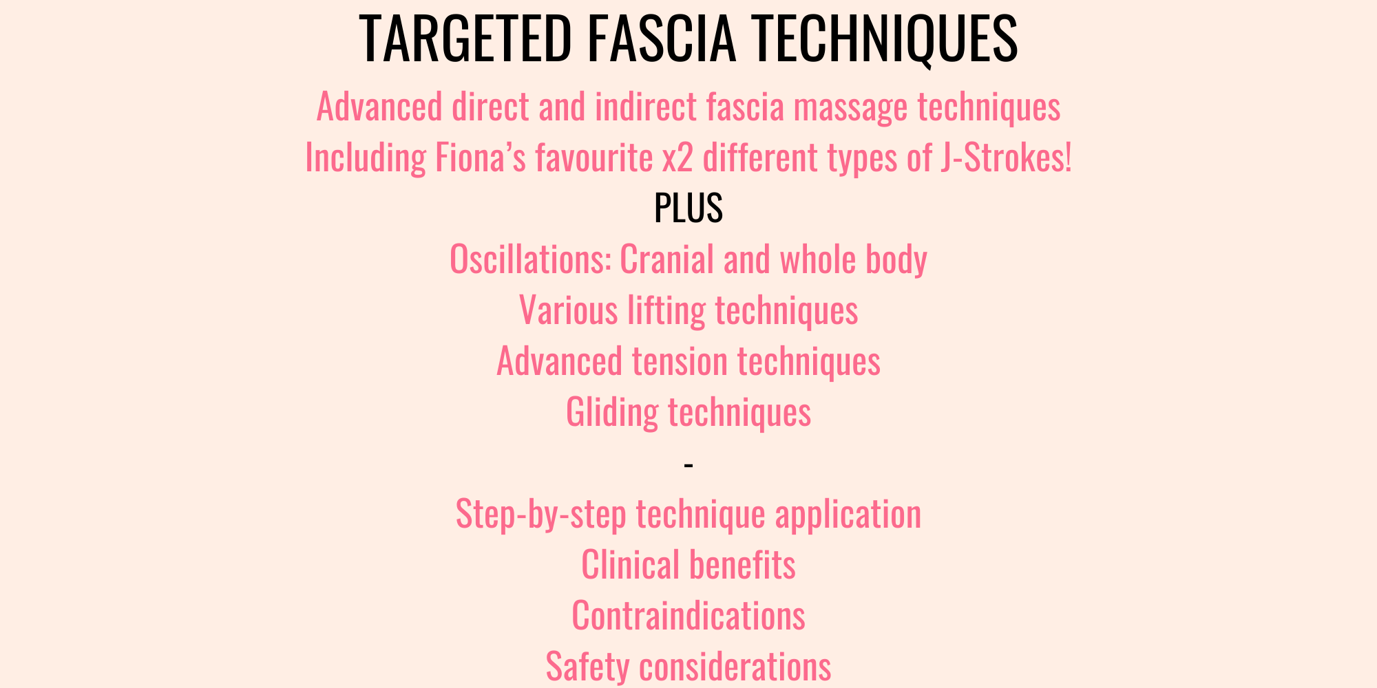 In it you learn advanced fascia massage techniques for the face. Including Fiona's personal favourite techniques such as two different types of J-Strokes!
