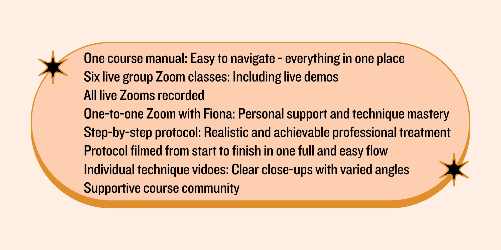 Yes! Every participant is entitled to a one hour one-to-one Zoom session with Fiona. You will both have a model present enabling Fiona to provide personalised, practical feedback on your technique and protocol delivery.